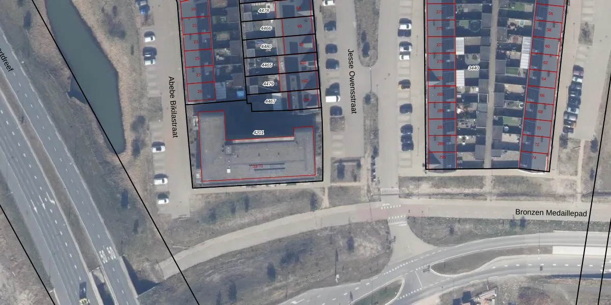 Abebe Bikilastraat 71 is gelegen op kadastraal perceel AMR04W4201. Deze kadastrale aanduiding is uniek en wordt gebruikt door het Kadaster om eigendomsrechten en andere zakelijke rechten vast te leggen. Het perceel maakt onderdeel uit van de kadastrale gemeente Almere.