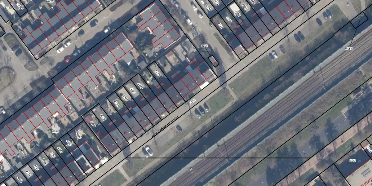 Het perceel waarop Accordeonstraat 59 staat heeft een oppervlakte van 4357 m². Dit is een zeer groot perceel. De perceeloppervlakte wordt geregistreerd door het Kadaster. Gedetailleerde informatie over de maten van dit perceel kunt u vinden in het rapport Kadastrale kaart met maatvoering van Accordeonstraat 59.