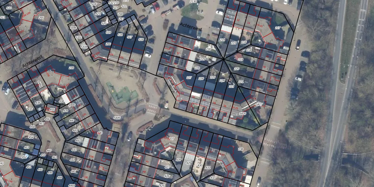 Het perceel waarop Achterwerf 63 staat heeft een oppervlakte van 292 m². Dit is een middelgroot perceel. De perceeloppervlakte wordt geregistreerd door het Kadaster. Gedetailleerde informatie over de maten van dit perceel kunt u vinden in het rapport Kadastrale kaart met maatvoering van Achterwerf 63.