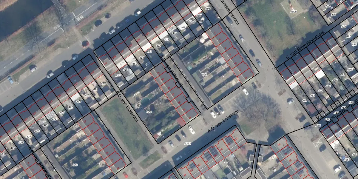 Het perceel waarop A.D. van Eckstraat 37 staat heeft een oppervlakte van 1044 m². Dit is een zeer groot perceel. De perceeloppervlakte wordt geregistreerd door het Kadaster. Gedetailleerde informatie over de maten van dit perceel kunt u vinden in het rapport Kadastrale kaart met maatvoering van A.D. van Eckstraat 37.