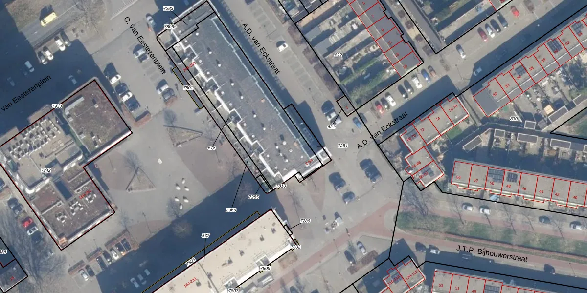 A.D. van Eckstraat 46 is gelegen op kadastraal perceel AMR04P578. Deze kadastrale aanduiding is uniek en wordt gebruikt door het Kadaster om eigendomsrechten en andere zakelijke rechten vast te leggen. Het perceel maakt onderdeel uit van de kadastrale gemeente Almere.