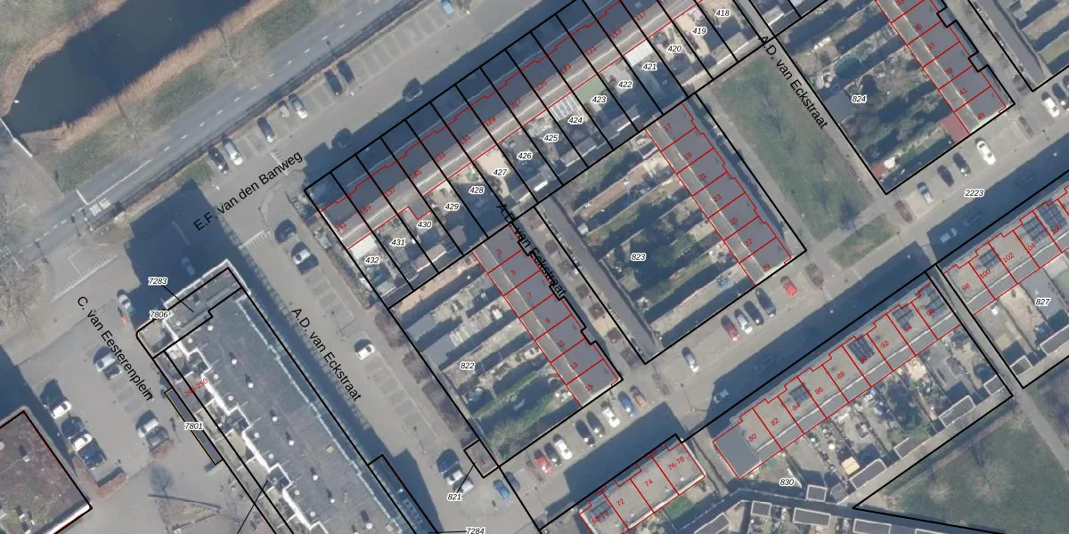 A.D. van Eckstraat 5 is gelegen op kadastraal perceel AMR04P822. Deze kadastrale aanduiding is uniek en wordt gebruikt door het Kadaster om eigendomsrechten en andere zakelijke rechten vast te leggen. Het perceel maakt onderdeel uit van de kadastrale gemeente Almere.