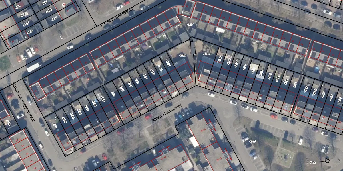Albert Helmanhof 25 is gelegen op kadastraal perceel AMR04Q4713. Deze kadastrale aanduiding is uniek en wordt gebruikt door het Kadaster om eigendomsrechten en andere zakelijke rechten vast te leggen. Het perceel maakt onderdeel uit van de kadastrale gemeente Almere.