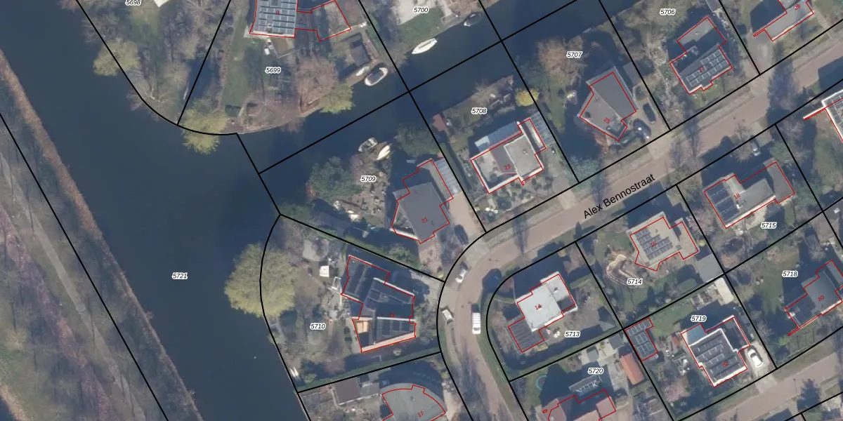 Alex Bennostraat 21 is gelegen op kadastraal perceel AMR04U5709. Deze kadastrale aanduiding is uniek en wordt gebruikt door het Kadaster om eigendomsrechten en andere zakelijke rechten vast te leggen. Het perceel maakt onderdeel uit van de kadastrale gemeente Almere.