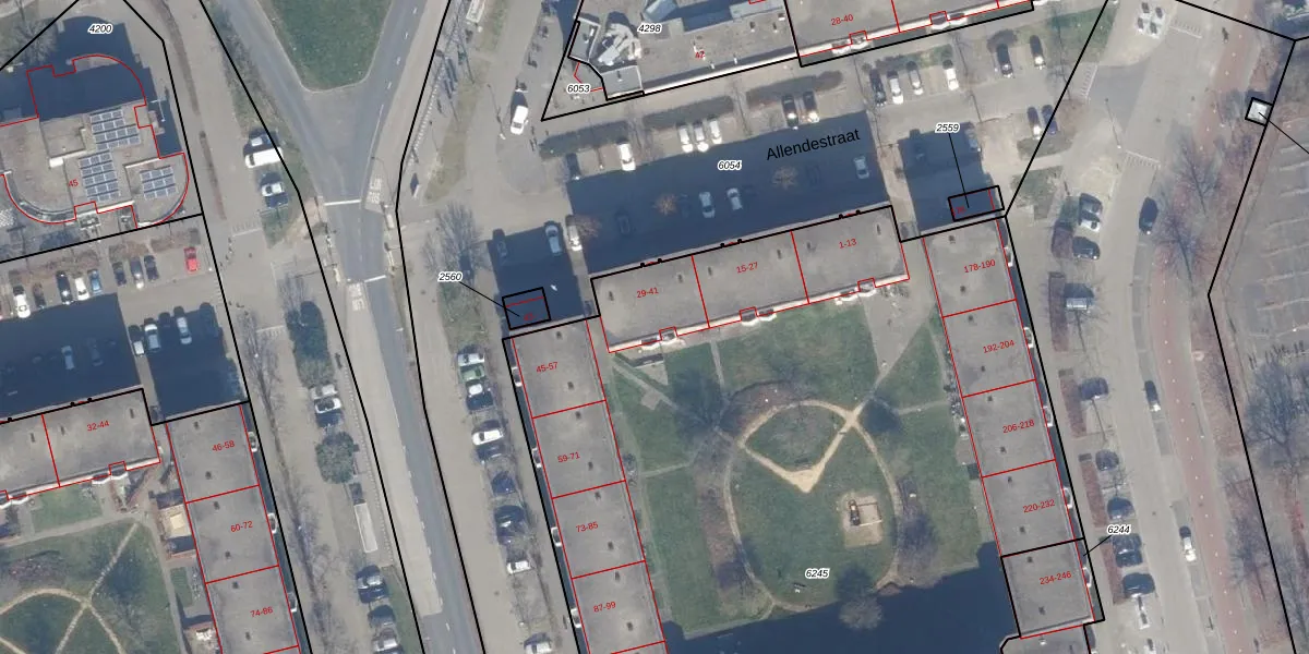 Het perceel waarop Allendestraat 39 staat heeft een oppervlakte van 6040 m². Dit is een zeer groot perceel. De perceeloppervlakte wordt geregistreerd door het Kadaster. Gedetailleerde informatie over de maten van dit perceel kunt u vinden in het rapport Kadastrale kaart met maatvoering van Allendestraat 39.
