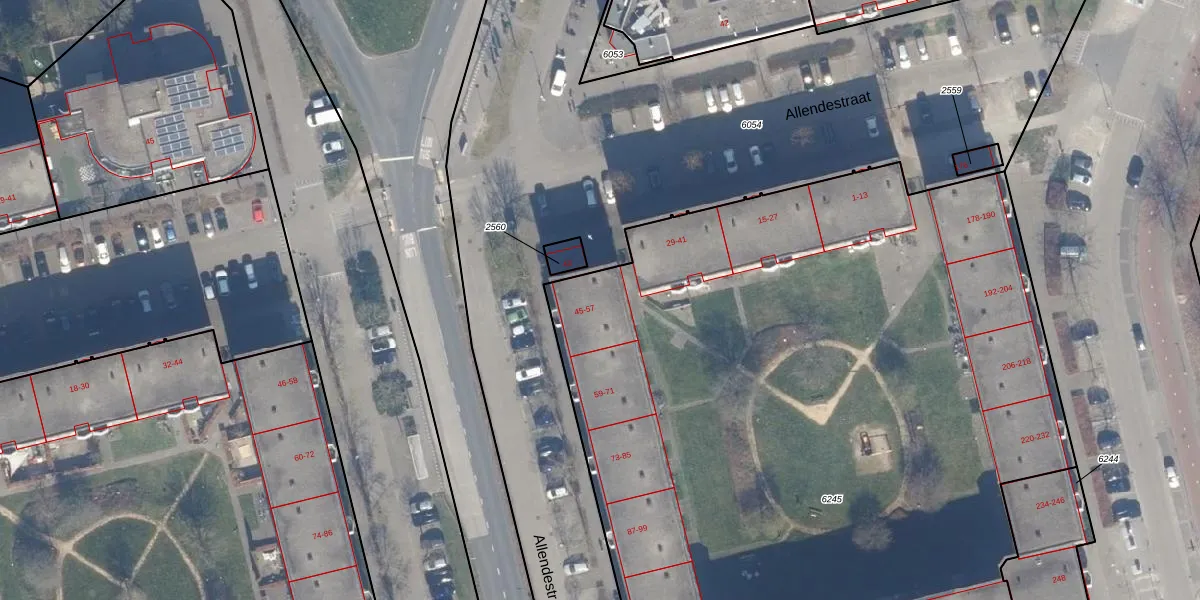 Allendestraat 53 is gelegen op kadastraal perceel AMR04O6245. Deze kadastrale aanduiding is uniek en wordt gebruikt door het Kadaster om eigendomsrechten en andere zakelijke rechten vast te leggen. Het perceel maakt onderdeel uit van de kadastrale gemeente Almere.