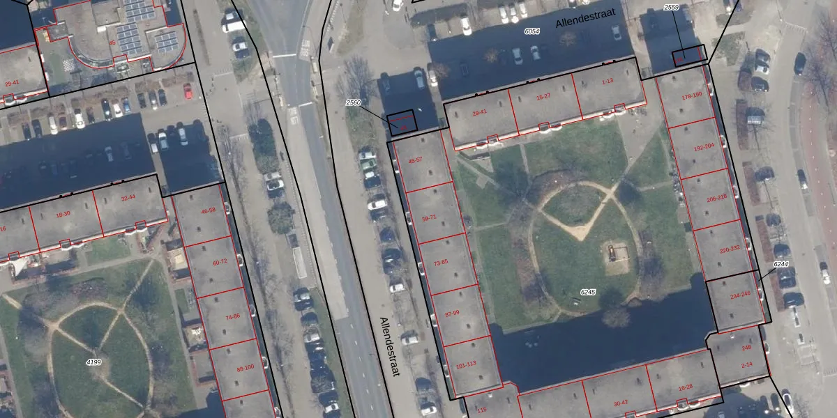 Allendestraat 59 is gelegen op kadastraal perceel AMR04O6245. Deze kadastrale aanduiding is uniek en wordt gebruikt door het Kadaster om eigendomsrechten en andere zakelijke rechten vast te leggen. Het perceel maakt onderdeel uit van de kadastrale gemeente Almere.