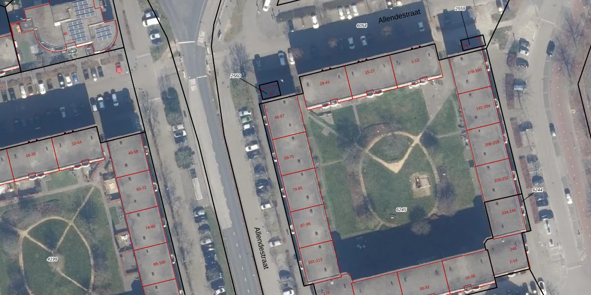 Allendestraat 65 is gelegen op kadastraal perceel AMR04O6245. Deze kadastrale aanduiding is uniek en wordt gebruikt door het Kadaster om eigendomsrechten en andere zakelijke rechten vast te leggen. Het perceel maakt onderdeel uit van de kadastrale gemeente Almere.