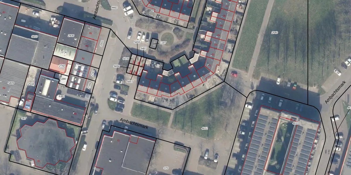 Het perceel waarop Ambachtsmark 17 staat heeft een oppervlakte van 5460 m². Dit is een zeer groot perceel. De perceeloppervlakte wordt geregistreerd door het Kadaster. Gedetailleerde informatie over de maten van dit perceel kunt u vinden in het rapport Kadastrale kaart met maatvoering van Ambachtsmark 17.