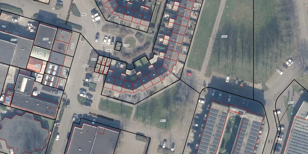 Het perceel waarop Ambachtsmark 19 staat heeft een oppervlakte van 5460 m². Dit is een zeer groot perceel. De perceeloppervlakte wordt geregistreerd door het Kadaster. Gedetailleerde informatie over de maten van dit perceel kunt u vinden in het rapport Kadastrale kaart met maatvoering van Ambachtsmark 19.
