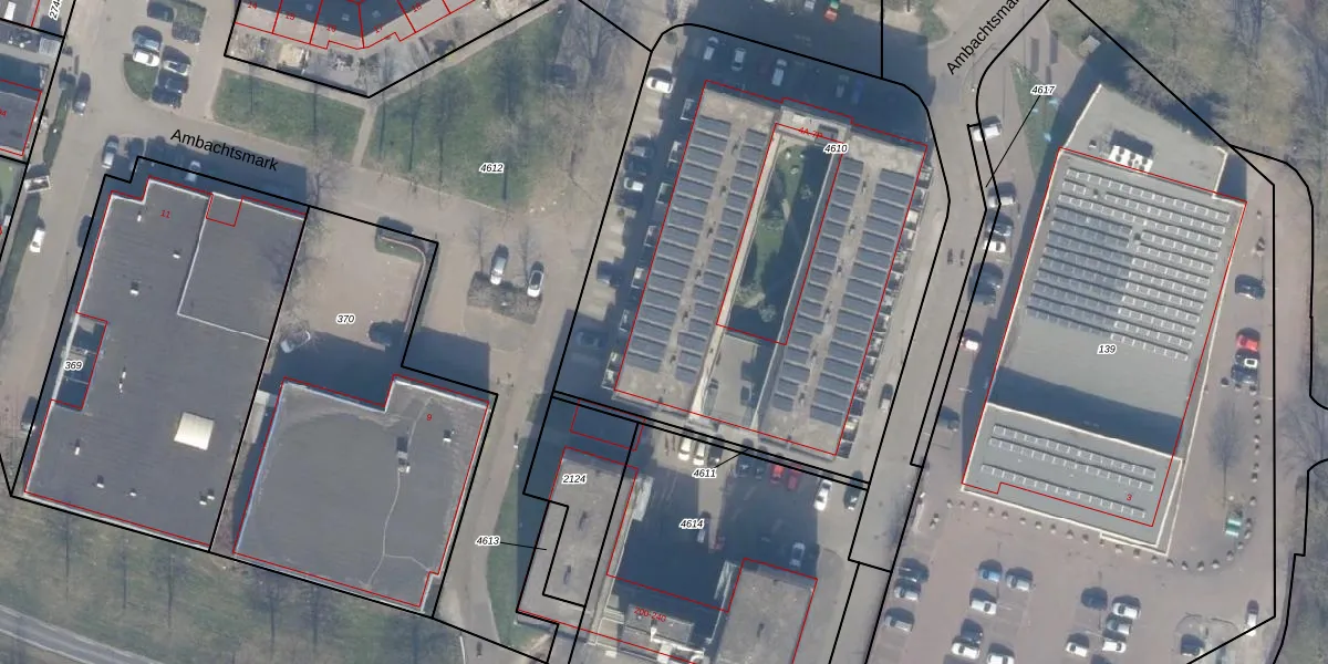 Het perceel waarop Ambachtsmark 5-J staat heeft een oppervlakte van 2856 m². Dit is een zeer groot perceel. De perceeloppervlakte wordt geregistreerd door het Kadaster. Gedetailleerde informatie over de maten van dit perceel kunt u vinden in het rapport Kadastrale kaart met maatvoering van Ambachtsmark 5-J.