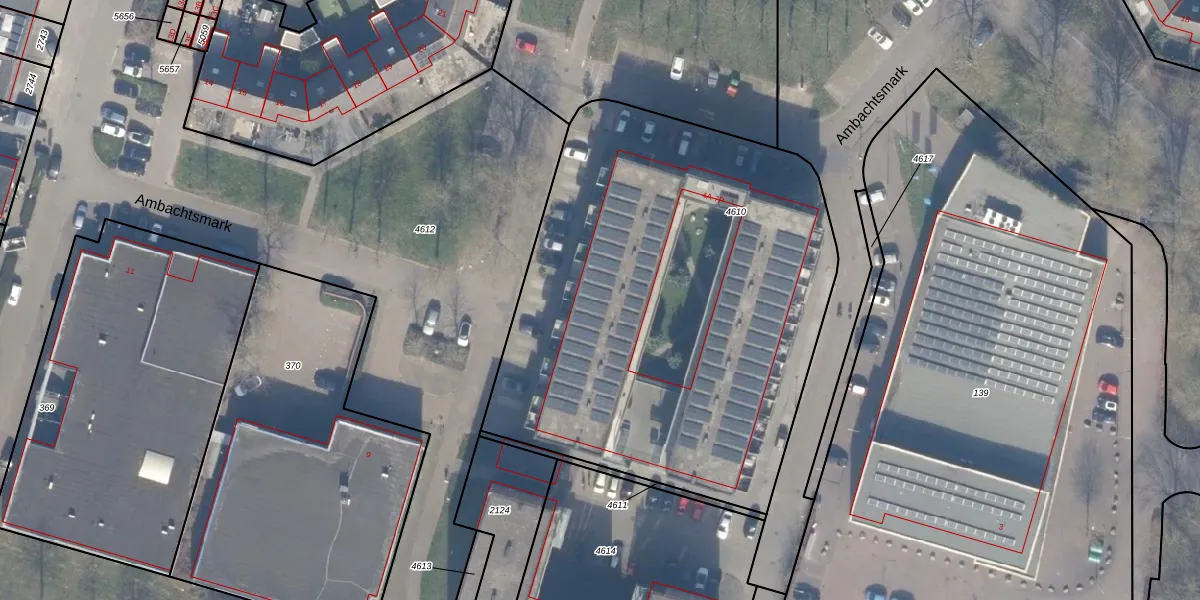 Het perceel waarop Ambachtsmark 5-L staat heeft een oppervlakte van 2856 m². Dit is een zeer groot perceel. De perceeloppervlakte wordt geregistreerd door het Kadaster. Gedetailleerde informatie over de maten van dit perceel kunt u vinden in het rapport Kadastrale kaart met maatvoering van Ambachtsmark 5-L.