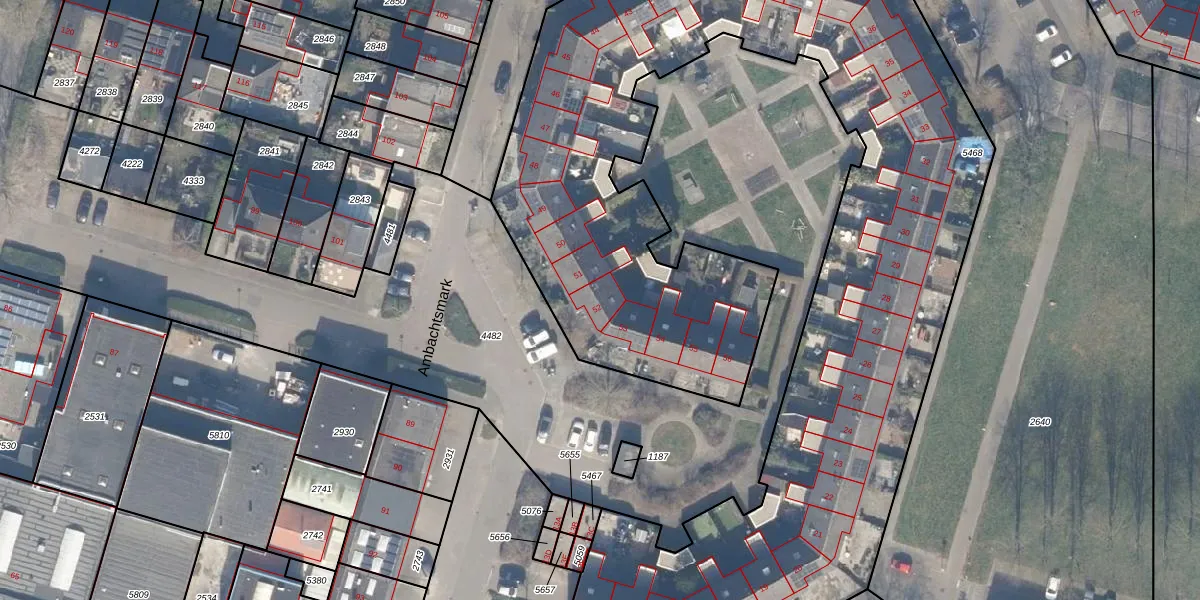 Het perceel waarop Ambachtsmark 52 staat heeft een oppervlakte van 5460 m². Dit is een zeer groot perceel. De perceeloppervlakte wordt geregistreerd door het Kadaster. Gedetailleerde informatie over de maten van dit perceel kunt u vinden in het rapport Kadastrale kaart met maatvoering van Ambachtsmark 52.