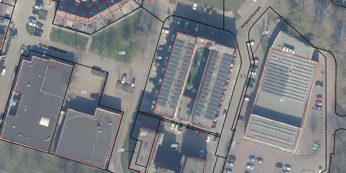 Het perceel waarop Ambachtsmark 6-K staat heeft een oppervlakte van 2856 m². Dit is een zeer groot perceel. De perceeloppervlakte wordt geregistreerd door het Kadaster. Gedetailleerde informatie over de maten van dit perceel kunt u vinden in het rapport Kadastrale kaart met maatvoering van Ambachtsmark 6-K.