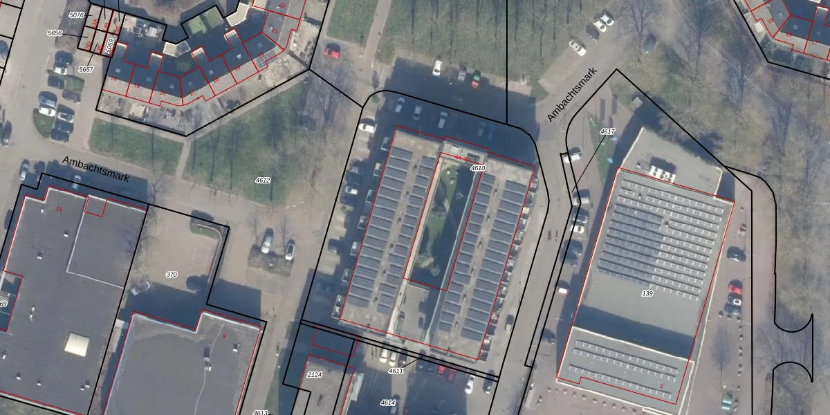 Het perceel waarop Ambachtsmark 7-M staat heeft een oppervlakte van 2856 m². Dit is een zeer groot perceel. De perceeloppervlakte wordt geregistreerd door het Kadaster. Gedetailleerde informatie over de maten van dit perceel kunt u vinden in het rapport Kadastrale kaart met maatvoering van Ambachtsmark 7-M.