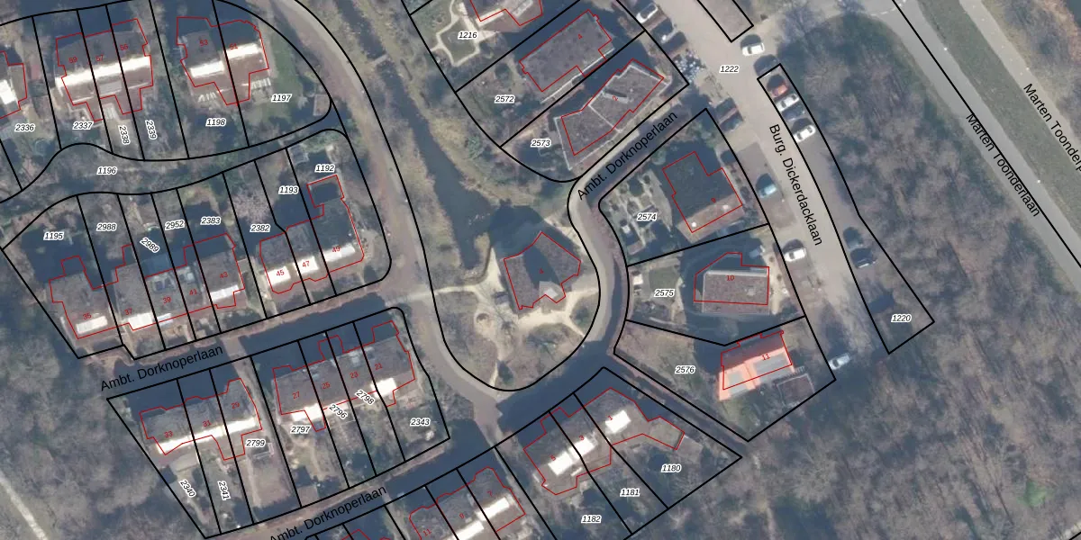 Het perceel waarop Ambt. Dorknoperlaan 4 staat heeft een oppervlakte van 3626 m². Dit is een zeer groot perceel. De perceeloppervlakte wordt geregistreerd door het Kadaster. Gedetailleerde informatie over de maten van dit perceel kunt u vinden in het rapport Kadastrale kaart met maatvoering van Ambt. Dorknoperlaan 4.