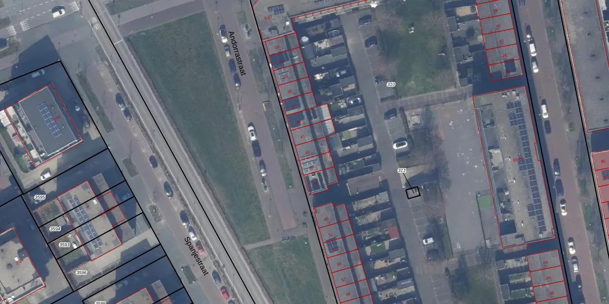 Het perceel waarop Andorrastraat 43 staat heeft een oppervlakte van 1,2 ha. Dit is een zeer groot perceel. De perceeloppervlakte wordt geregistreerd door het Kadaster. Gedetailleerde informatie over de maten van dit perceel kunt u vinden in het rapport Kadastrale kaart met maatvoering van Andorrastraat 43.