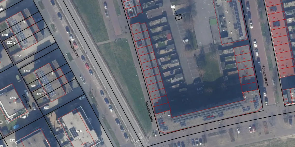 Het perceel waarop Andorrastraat 61 staat heeft een oppervlakte van 1,2 ha. Dit is een zeer groot perceel. De perceeloppervlakte wordt geregistreerd door het Kadaster. Gedetailleerde informatie over de maten van dit perceel kunt u vinden in het rapport Kadastrale kaart met maatvoering van Andorrastraat 61.
