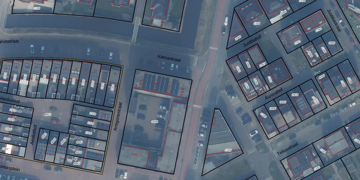 Antigonestraat 45 is gelegen op kadastraal perceel AMR04W3438. Deze kadastrale aanduiding is uniek en wordt gebruikt door het Kadaster om eigendomsrechten en andere zakelijke rechten vast te leggen. Het perceel maakt onderdeel uit van de kadastrale gemeente Almere.