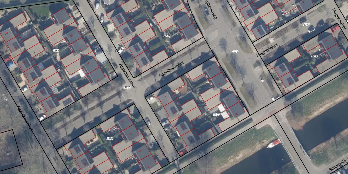 Het perceel waarop Appelboomhof 1 staat heeft een oppervlakte van 1858 m². Dit is een zeer groot perceel. De perceeloppervlakte wordt geregistreerd door het Kadaster. Gedetailleerde informatie over de maten van dit perceel kunt u vinden in het rapport Kadastrale kaart met maatvoering van Appelboomhof 1.