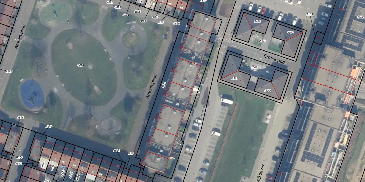 Het perceel waarop Arnhemplein 48 staat heeft een oppervlakte van 1826 m². Dit is een zeer groot perceel. De perceeloppervlakte wordt geregistreerd door het Kadaster. Gedetailleerde informatie over de maten van dit perceel kunt u vinden in het rapport Kadastrale kaart met maatvoering van Arnhemplein 48.
