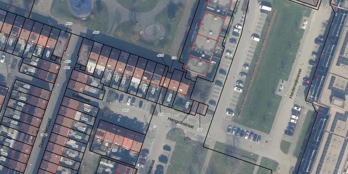 Het adres ligt op het perceel AMR04-K-4833, dat zich in de kadastrale gemeente Almere bevindt. Het perceel is kleiner dan gemiddeld in Almere. Het perceel is 126 m² groot, terwijl het gemiddelde ligt op 3328,15 m². De grootste perceeloppervlakte in de kadastrale gemeente is 32,12 km². De kleinste oppervlakte bedraagt 0 m². Dit is het enige adres dat aanwezig is op het perceel. In de Basisregistratie Kadaster (BRK) werden de grenzen van het perceel geregistreerd op 27-01-1999.