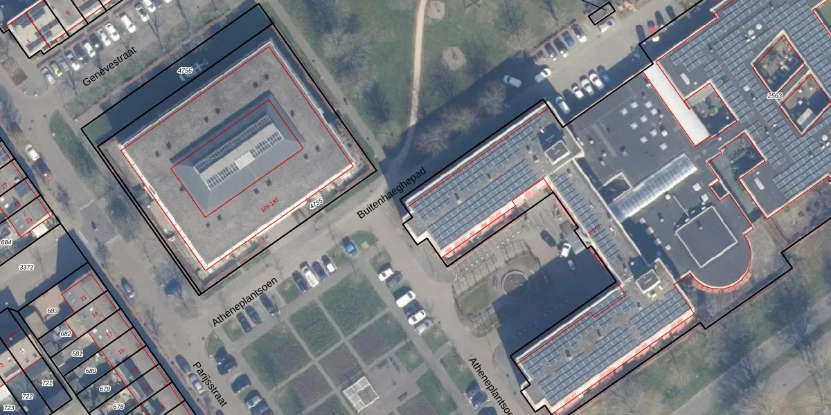 Het perceel waarop Atheneplantsoen 107 staat heeft een oppervlakte van 9585 m². Dit is een zeer groot perceel. De perceeloppervlakte wordt geregistreerd door het Kadaster. Gedetailleerde informatie over de maten van dit perceel kunt u vinden in het rapport Kadastrale kaart met maatvoering van Atheneplantsoen 107.