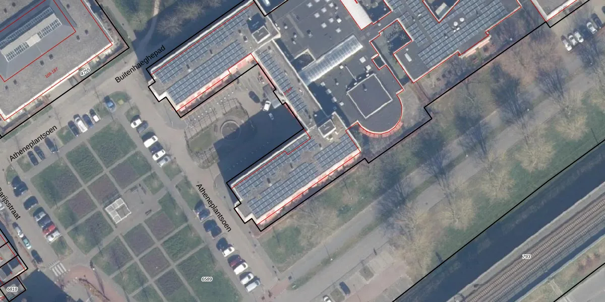 Het perceel waarop Atheneplantsoen 12 staat heeft een oppervlakte van 9585 m². Dit is een zeer groot perceel. De perceeloppervlakte wordt geregistreerd door het Kadaster. Gedetailleerde informatie over de maten van dit perceel kunt u vinden in het rapport Kadastrale kaart met maatvoering van Atheneplantsoen 12.
