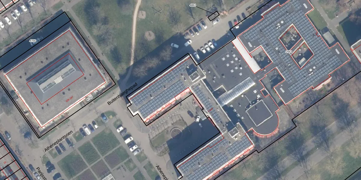 Het perceel waarop Atheneplantsoen 13 staat heeft een oppervlakte van 9585 m². Dit is een zeer groot perceel. De perceeloppervlakte wordt geregistreerd door het Kadaster. Gedetailleerde informatie over de maten van dit perceel kunt u vinden in het rapport Kadastrale kaart met maatvoering van Atheneplantsoen 13.