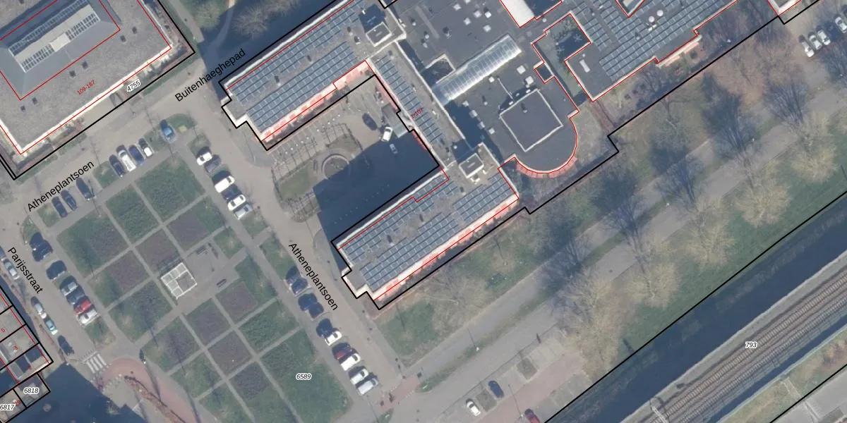 Het perceel waarop Atheneplantsoen 14 staat heeft een oppervlakte van 9585 m². Dit is een zeer groot perceel. De perceeloppervlakte wordt geregistreerd door het Kadaster. Gedetailleerde informatie over de maten van dit perceel kunt u vinden in het rapport Kadastrale kaart met maatvoering van Atheneplantsoen 14.