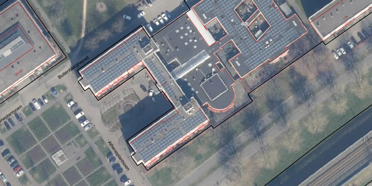 Het perceel waarop Atheneplantsoen 30 staat heeft een oppervlakte van 9585 m². Dit is een zeer groot perceel. De perceeloppervlakte wordt geregistreerd door het Kadaster. Gedetailleerde informatie over de maten van dit perceel kunt u vinden in het rapport Kadastrale kaart met maatvoering van Atheneplantsoen 30.