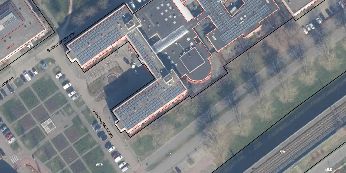 Het perceel waarop Atheneplantsoen 36 staat heeft een oppervlakte van 9585 m². Dit is een zeer groot perceel. De perceeloppervlakte wordt geregistreerd door het Kadaster. Gedetailleerde informatie over de maten van dit perceel kunt u vinden in het rapport Kadastrale kaart met maatvoering van Atheneplantsoen 36.