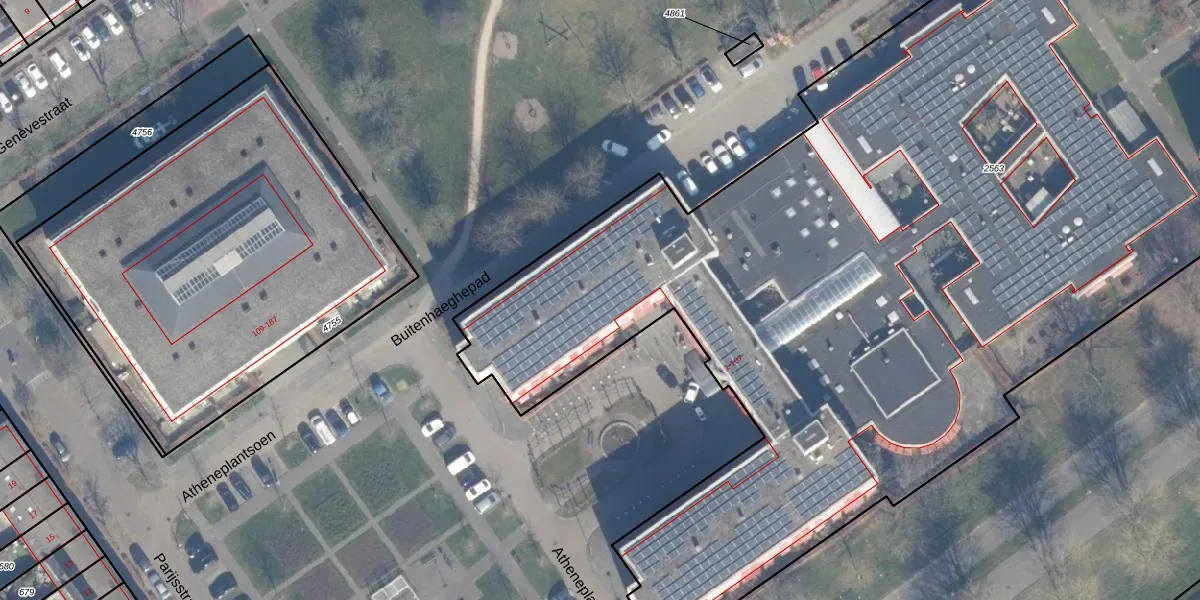 Het perceel waarop Atheneplantsoen 41 staat heeft een oppervlakte van 9585 m². Dit is een zeer groot perceel. De perceeloppervlakte wordt geregistreerd door het Kadaster. Gedetailleerde informatie over de maten van dit perceel kunt u vinden in het rapport Kadastrale kaart met maatvoering van Atheneplantsoen 41.