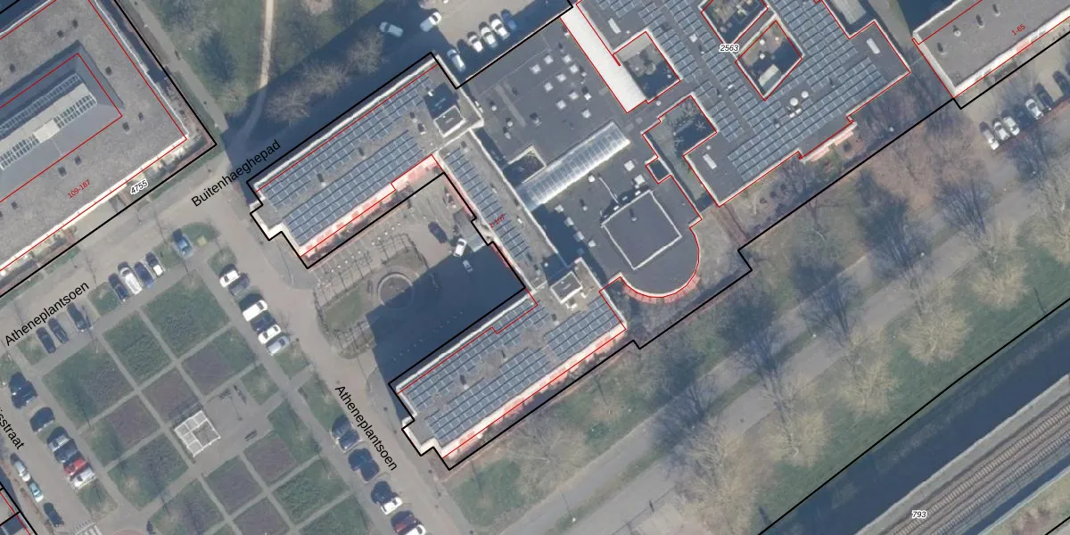 Het perceel waarop Atheneplantsoen 6 staat heeft een oppervlakte van 9585 m². Dit is een zeer groot perceel. De perceeloppervlakte wordt geregistreerd door het Kadaster. Gedetailleerde informatie over de maten van dit perceel kunt u vinden in het rapport Kadastrale kaart met maatvoering van Atheneplantsoen 6.