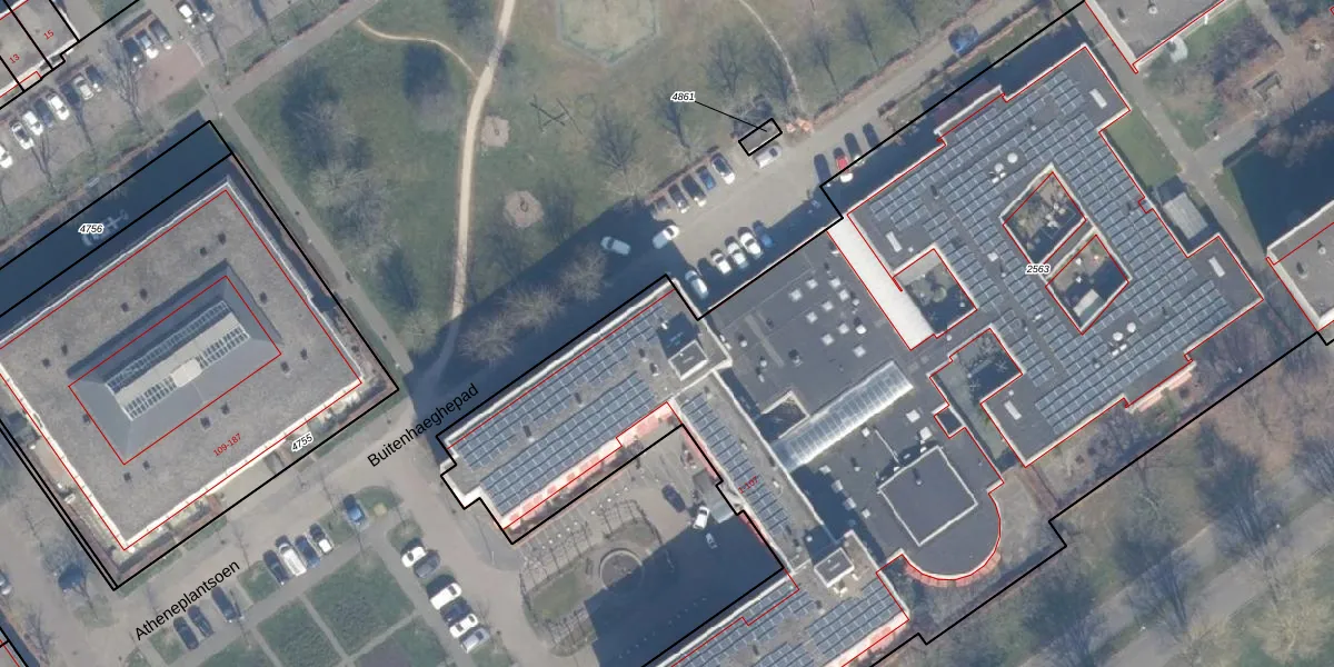 Het perceel waarop Atheneplantsoen 63 staat heeft een oppervlakte van 9585 m². Dit is een zeer groot perceel. De perceeloppervlakte wordt geregistreerd door het Kadaster. Gedetailleerde informatie over de maten van dit perceel kunt u vinden in het rapport Kadastrale kaart met maatvoering van Atheneplantsoen 63.