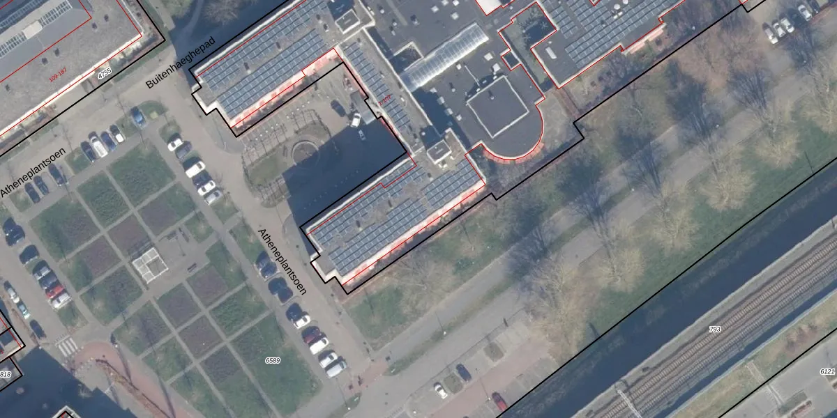 Het perceel waarop Atheneplantsoen 66 staat heeft een oppervlakte van 9585 m². Dit is een zeer groot perceel. De perceeloppervlakte wordt geregistreerd door het Kadaster. Gedetailleerde informatie over de maten van dit perceel kunt u vinden in het rapport Kadastrale kaart met maatvoering van Atheneplantsoen 66.