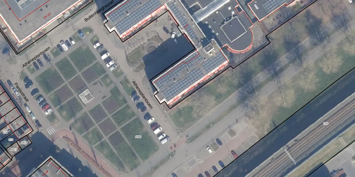 Het perceel waarop Atheneplantsoen 74 staat heeft een oppervlakte van 9585 m². Dit is een zeer groot perceel. De perceeloppervlakte wordt geregistreerd door het Kadaster. Gedetailleerde informatie over de maten van dit perceel kunt u vinden in het rapport Kadastrale kaart met maatvoering van Atheneplantsoen 74.