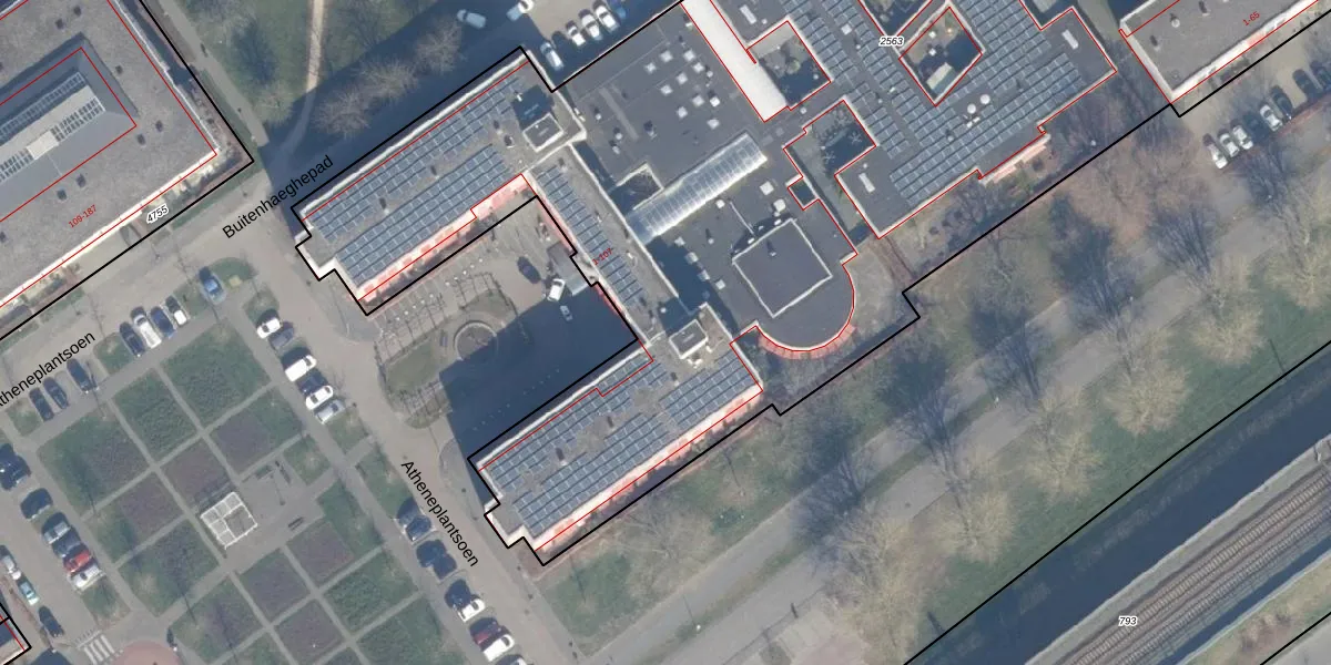 Het perceel waarop Atheneplantsoen 8 staat heeft een oppervlakte van 9585 m². Dit is een zeer groot perceel. De perceeloppervlakte wordt geregistreerd door het Kadaster. Gedetailleerde informatie over de maten van dit perceel kunt u vinden in het rapport Kadastrale kaart met maatvoering van Atheneplantsoen 8.