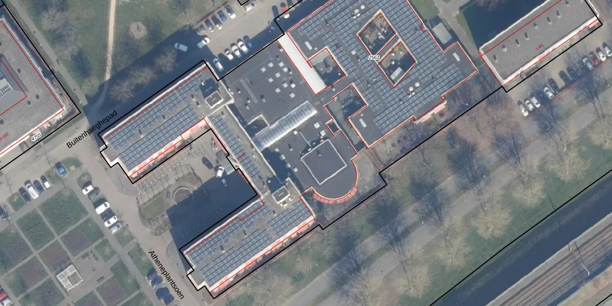 Het perceel waarop Atheneplantsoen 84 staat heeft een oppervlakte van 9585 m². Dit is een zeer groot perceel. De perceeloppervlakte wordt geregistreerd door het Kadaster. Gedetailleerde informatie over de maten van dit perceel kunt u vinden in het rapport Kadastrale kaart met maatvoering van Atheneplantsoen 84.