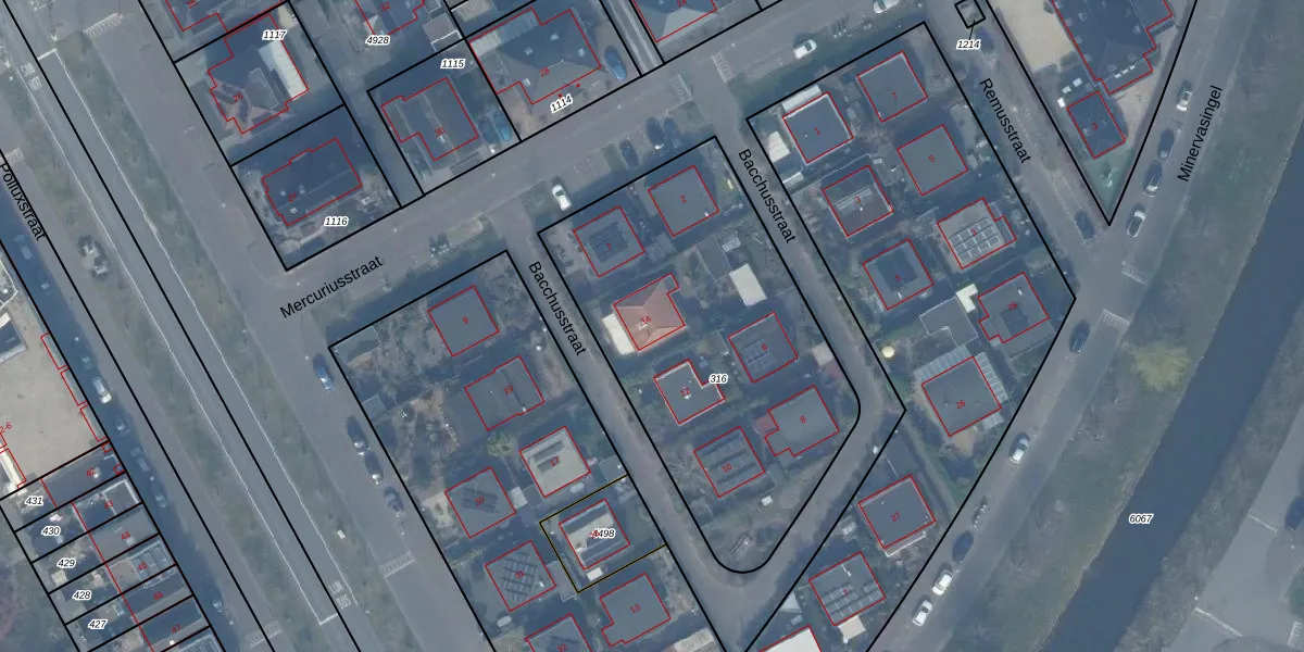 Het perceel waarop Bacchusstraat 14 staat heeft een oppervlakte van 1730 m². Dit is een zeer groot perceel. De perceeloppervlakte wordt geregistreerd door het Kadaster. Gedetailleerde informatie over de maten van dit perceel kunt u vinden in het rapport Kadastrale kaart met maatvoering van Bacchusstraat 14.