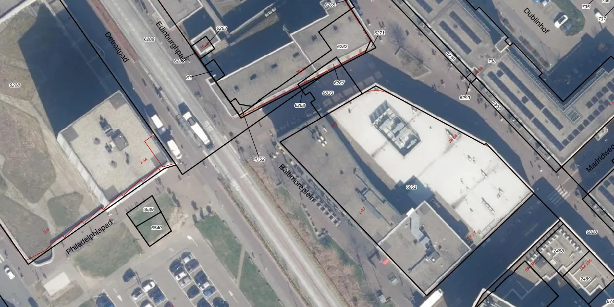 Het perceel waarop Baltimoreplein 1 staat heeft een oppervlakte van 2824 m². Dit is een zeer groot perceel. De perceeloppervlakte wordt geregistreerd door het Kadaster. Gedetailleerde informatie over de maten van dit perceel kunt u vinden in het rapport Kadastrale kaart met maatvoering van Baltimoreplein 1.