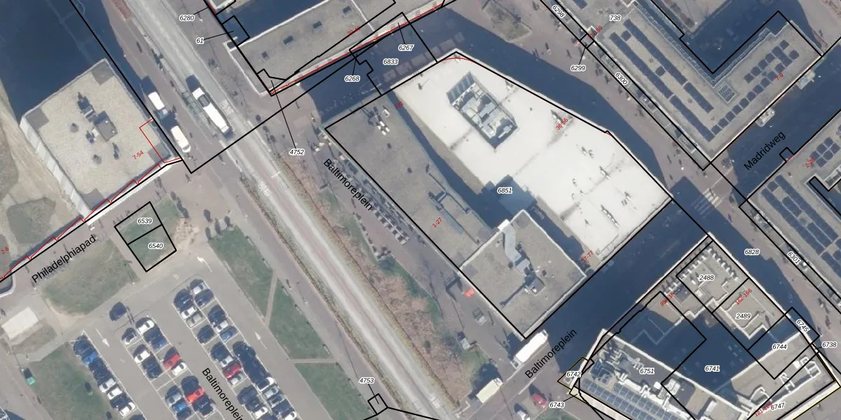 Het perceel waarop Baltimoreplein 15 staat heeft een oppervlakte van 2824 m². Dit is een zeer groot perceel. De perceeloppervlakte wordt geregistreerd door het Kadaster. Gedetailleerde informatie over de maten van dit perceel kunt u vinden in het rapport Kadastrale kaart met maatvoering van Baltimoreplein 15.
