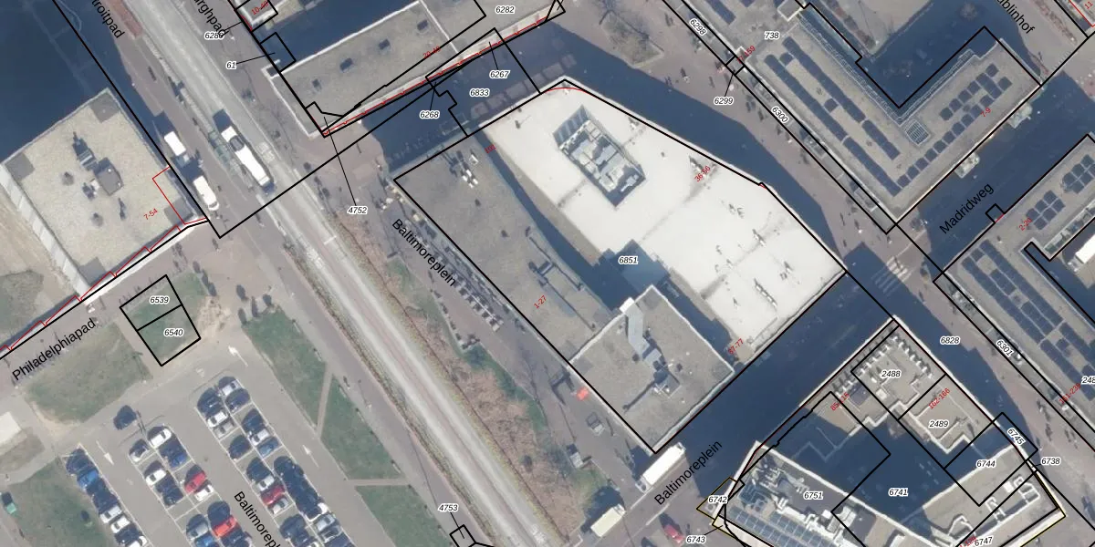 Het perceel waarop Baltimoreplein 49 staat heeft een oppervlakte van 2824 m². Dit is een zeer groot perceel. De perceeloppervlakte wordt geregistreerd door het Kadaster. Gedetailleerde informatie over de maten van dit perceel kunt u vinden in het rapport Kadastrale kaart met maatvoering van Baltimoreplein 49.