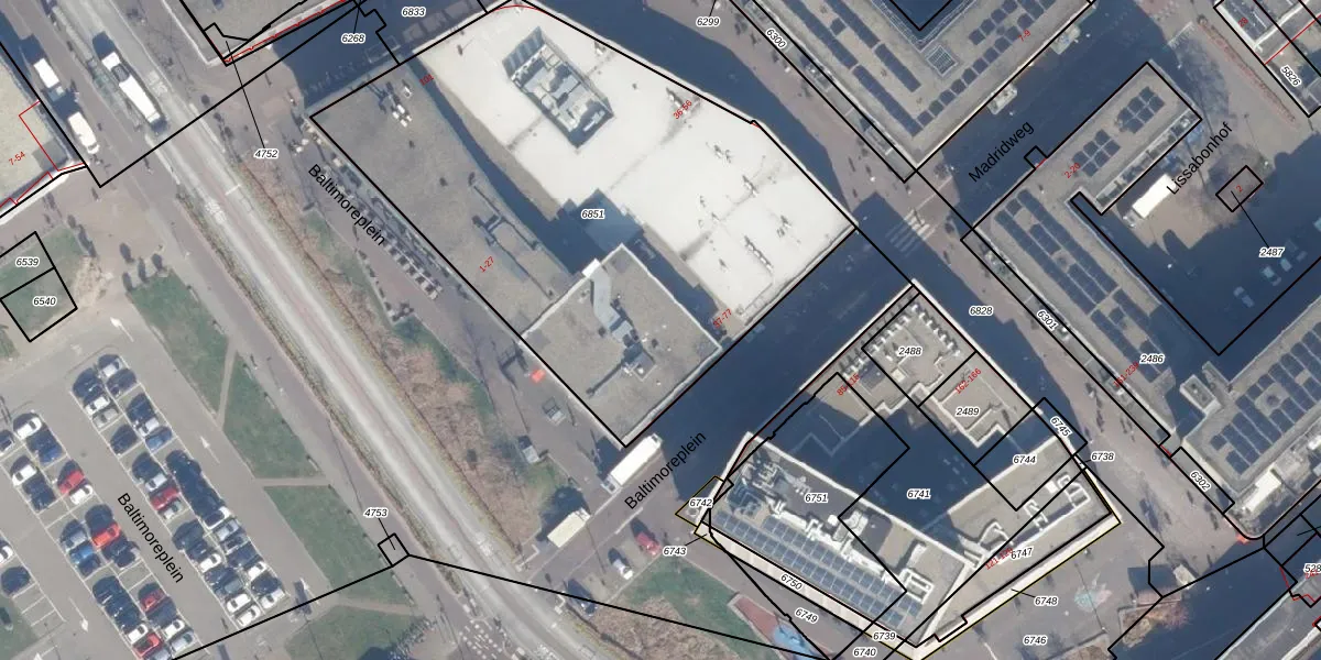 Het perceel waarop Baltimoreplein 61 staat heeft een oppervlakte van 2824 m². Dit is een zeer groot perceel. De perceeloppervlakte wordt geregistreerd door het Kadaster. Gedetailleerde informatie over de maten van dit perceel kunt u vinden in het rapport Kadastrale kaart met maatvoering van Baltimoreplein 61.