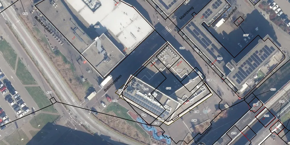 Het perceel waarop Baltimoreplein 97 staat heeft een oppervlakte van 585 m². Dit is een groot perceel. De perceeloppervlakte wordt geregistreerd door het Kadaster. Gedetailleerde informatie over de maten van dit perceel kunt u vinden in het rapport Kadastrale kaart met maatvoering van Baltimoreplein 97.
