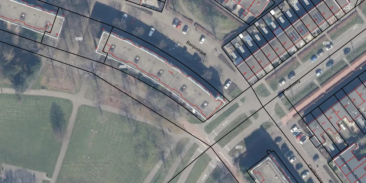 Het perceel waarop Banjostraat 27 staat heeft een oppervlakte van 1374 m². Dit is een zeer groot perceel. De perceeloppervlakte wordt geregistreerd door het Kadaster. Gedetailleerde informatie over de maten van dit perceel kunt u vinden in het rapport Kadastrale kaart met maatvoering van Banjostraat 27.