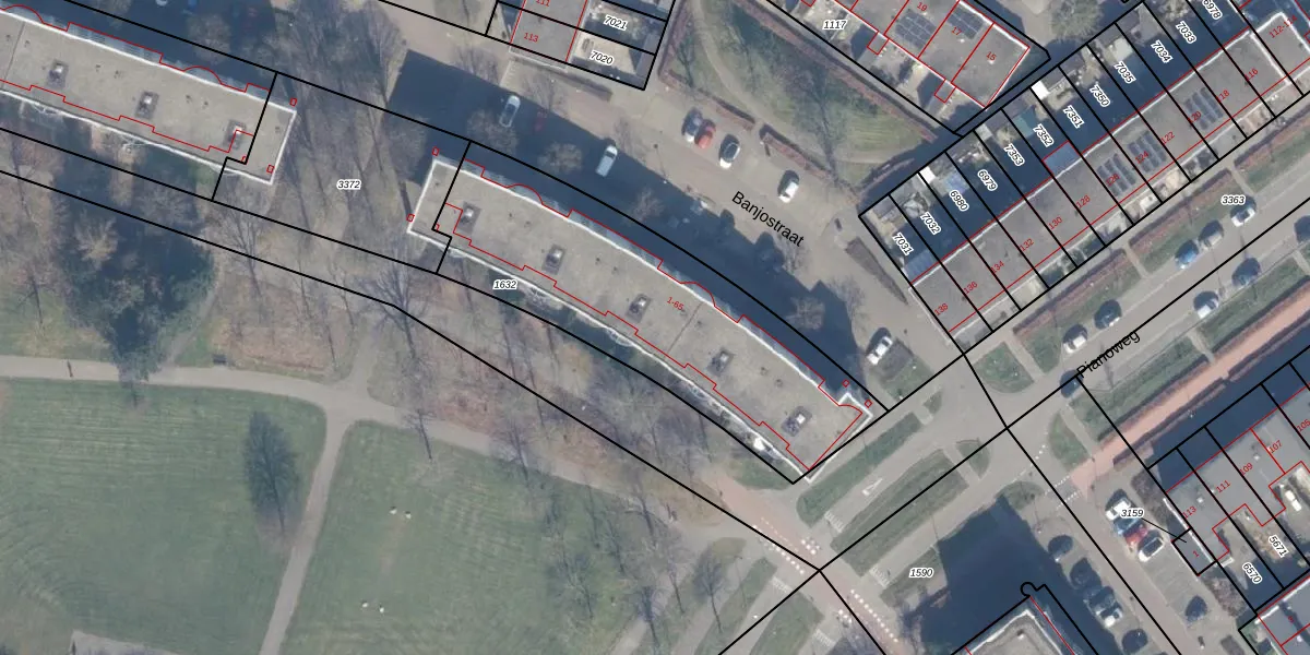 Het perceel waarop Banjostraat 41 staat heeft een oppervlakte van 1374 m². Dit is een zeer groot perceel. De perceeloppervlakte wordt geregistreerd door het Kadaster. Gedetailleerde informatie over de maten van dit perceel kunt u vinden in het rapport Kadastrale kaart met maatvoering van Banjostraat 41.