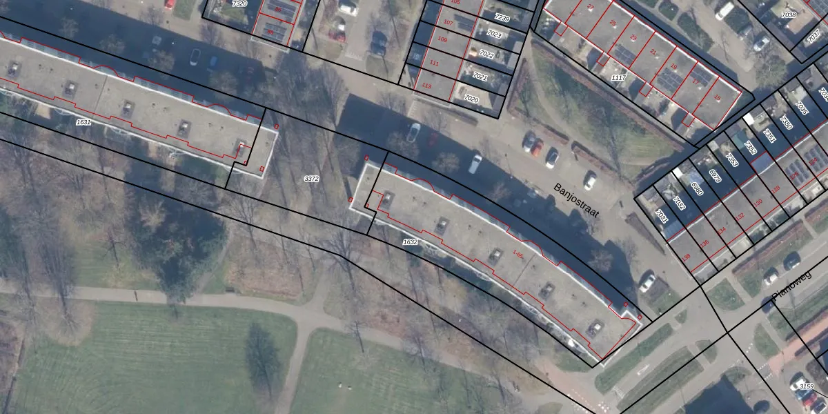 Het perceel waarop Banjostraat 59 staat heeft een oppervlakte van 1374 m². Dit is een zeer groot perceel. De perceeloppervlakte wordt geregistreerd door het Kadaster. Gedetailleerde informatie over de maten van dit perceel kunt u vinden in het rapport Kadastrale kaart met maatvoering van Banjostraat 59.