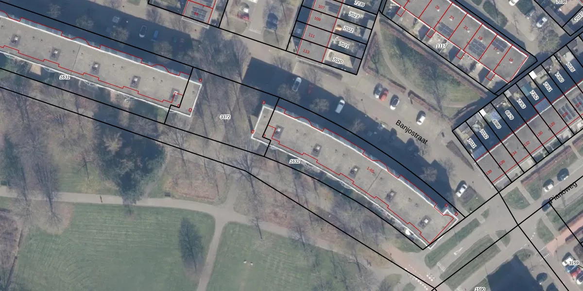 Het perceel waarop Banjostraat 63 staat heeft een oppervlakte van 1374 m². Dit is een zeer groot perceel. De perceeloppervlakte wordt geregistreerd door het Kadaster. Gedetailleerde informatie over de maten van dit perceel kunt u vinden in het rapport Kadastrale kaart met maatvoering van Banjostraat 63.