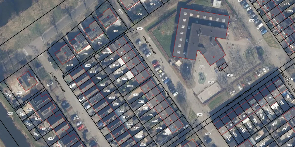 Het perceel waarop Baroniestraat 45 staat heeft een oppervlakte van 182 m². Dit is een middelgroot perceel. De perceeloppervlakte wordt geregistreerd door het Kadaster. Gedetailleerde informatie over de maten van dit perceel kunt u vinden in het rapport Kadastrale kaart met maatvoering van Baroniestraat 45.